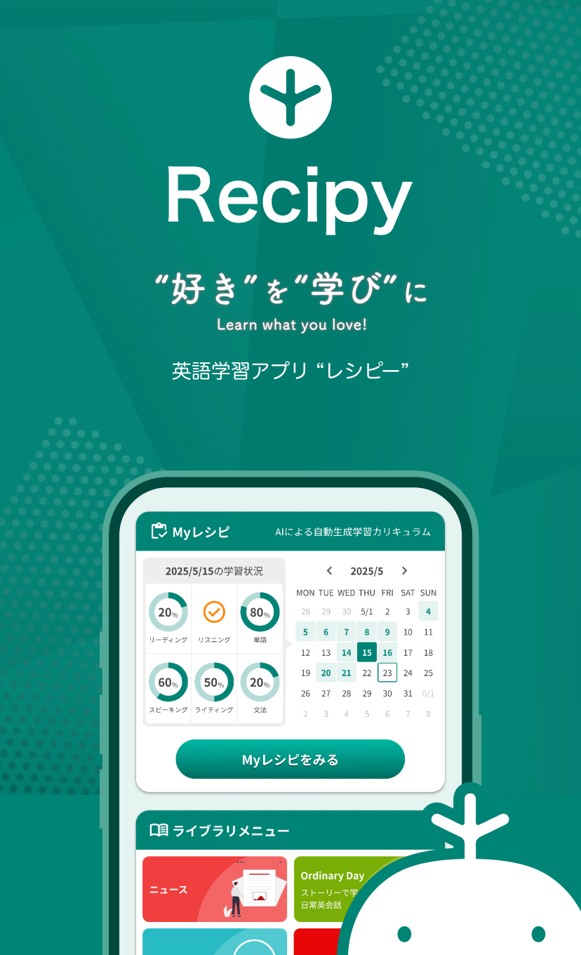 学習者のレベルや興味、学習時間、伸ばしたいスキルに合ったコンテンツを選び、最短で英語力が上がるようにレシピ(カリキュラム)を作り、毎日お届けします!