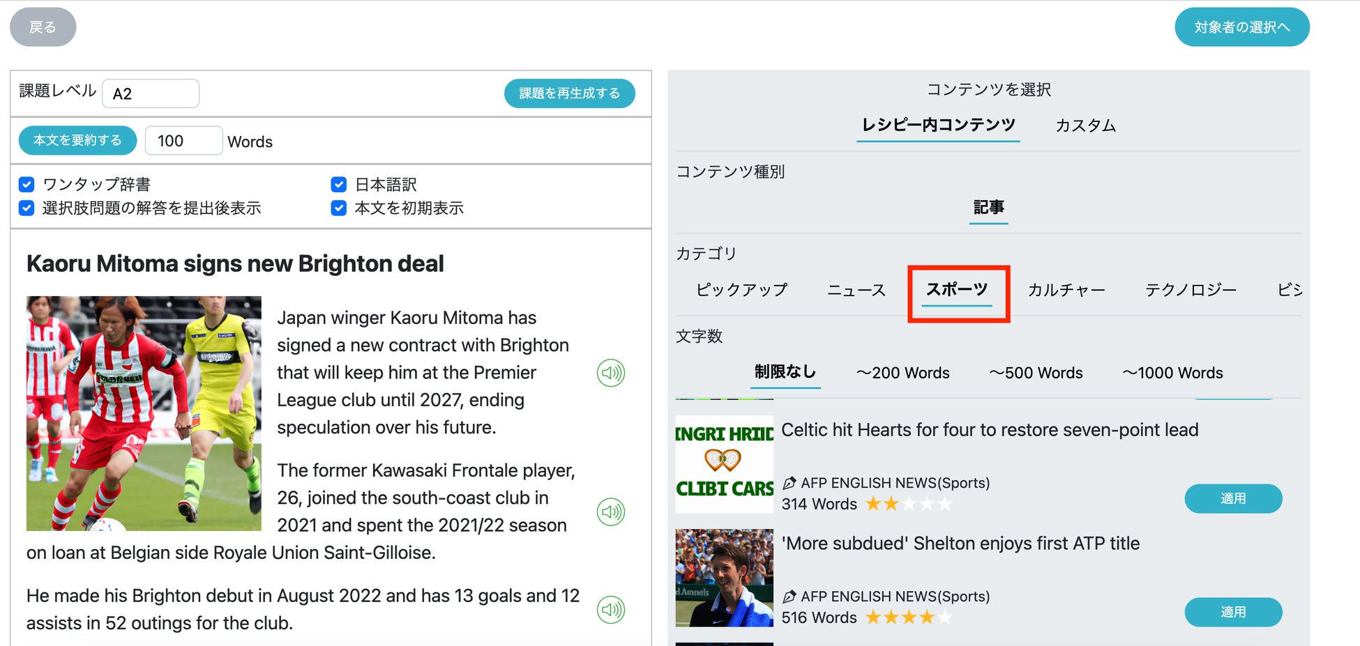 カテゴリでスポーツをクリックして頂くとAFP通信の記事が確認できます。スポーツの最新の話題から課題作成ができるようになりましたので、ぜひご活用ください。