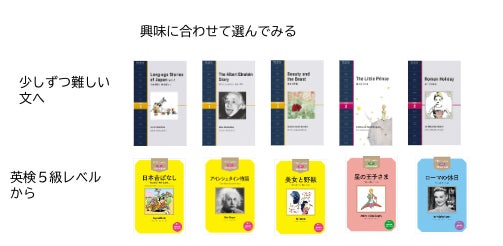 今回の「ローマの休日」追加搭載により、以下5タイトルがステップラダー、ラダーでレシピーアプリ上に揃うことになり、学習者の興味に応じて、レベル別に学習ができるようになりました。