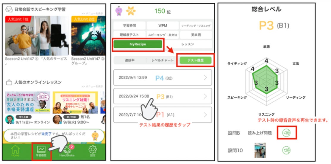 過去のテスト結果の一覧や、テスト時の録音音声を再生することも可能です。