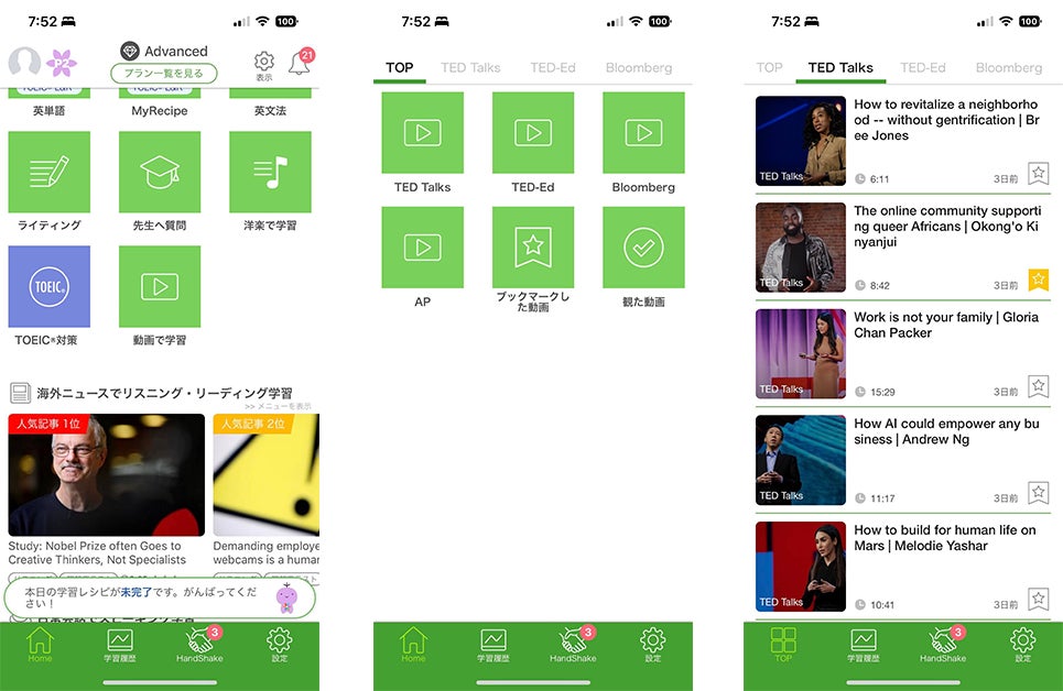 TED Talks、TED-Ed、Bloomberg、APの動画学習コンテンツが搭載されています。