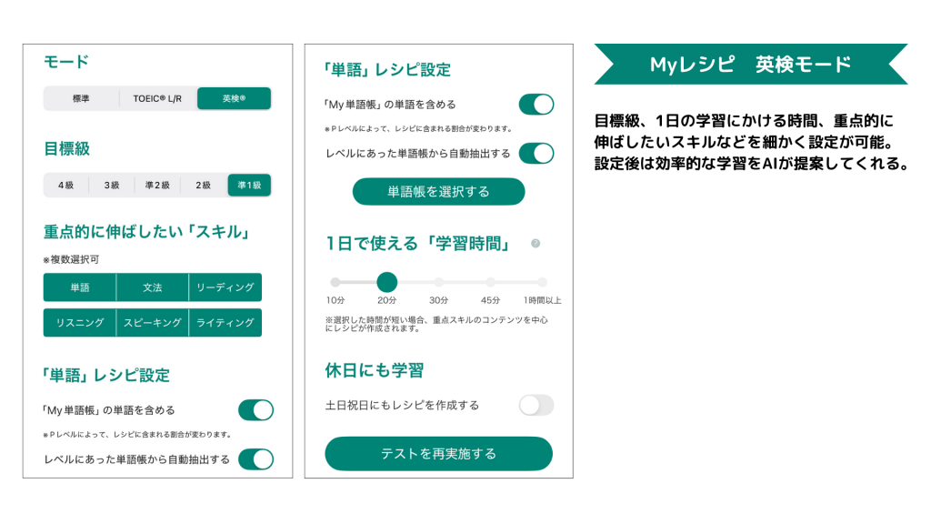 「Myレシピ」の英検モードの対応級は準1級、2級、準2級、3級、4級で、ユーザーはどの級に挑戦したいかを選ぶことで、毎日、「目標級合格」のための練習問題(単語、リーディング、リスニング、ライティング)が出題されます。