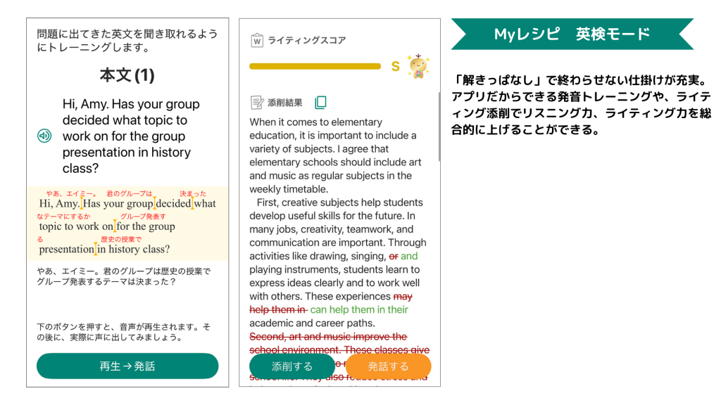 ユーザーは「問題を解いて終わり」ではなく、学習内容の定着のためのトレーニングを行うことができます。アプリならではの音声を利用したリスニングトレーニングや、英作文の内容を添削してくれるライティングトレーニングで、英検の目標級の合格の実現とともに、総合的な英語力の向上もしっかりサポートします。