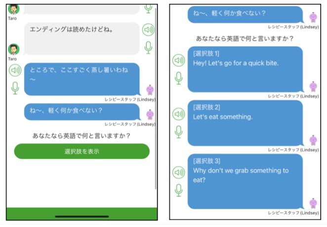 会話の最後のフレーズが問題形式になっています。選択肢をどれか一つタップすると下記4つのコメントのどれかが表示されます。