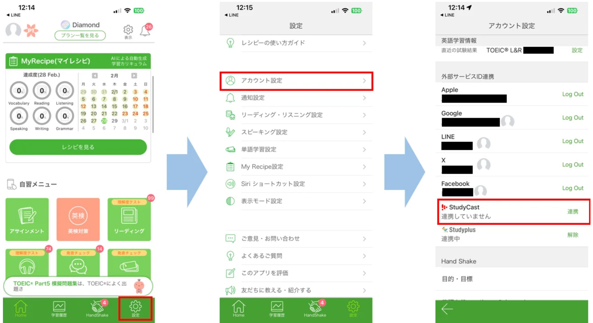 ③ 外部サービスID連携から「Study Cast」の「連携」をタップ
